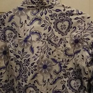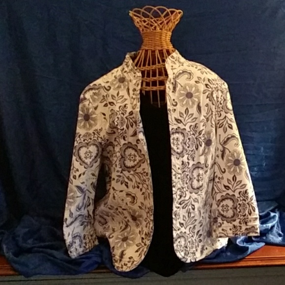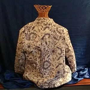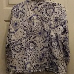 Beautiful classic blue & white pattern, excellent condition. Stand up collar with small grommet trim around it. The trim continues around perimeter of jacket and at end of each sleeve. Well made with great detail. No closure, so no buttons. 97% cotton, 5% spandex, machine wash cold, line dry. Sleeve is 18", pit to pit is 21.5", shoulder to hem is 25".