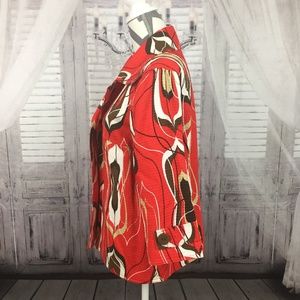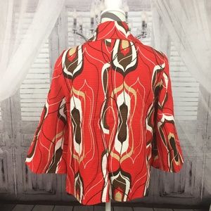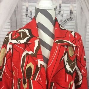 Multiples Abstract Print Open Swing Jacket. Size Medium. Excellent preowned condition, but missing care tag. Some wear on belt. Comfortable lightweight textured blazer that can be worn with or without the belt. Great with a pencil skirt for the office or with jeans for a more casual look.