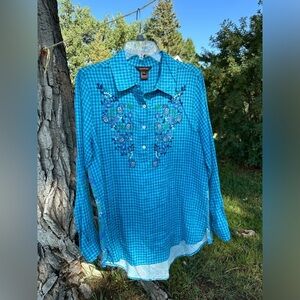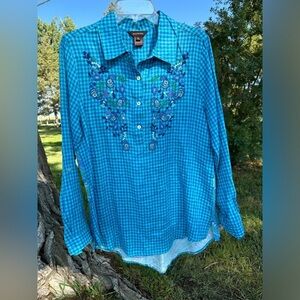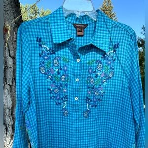 Multiples Paisley & Blue Linen Checkered Button Down Casual Blouse Womens Medium