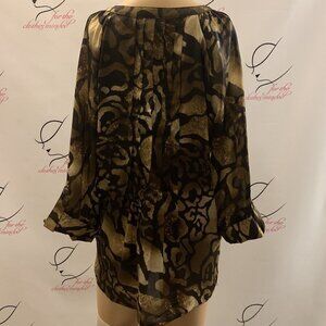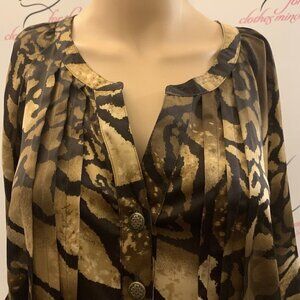 Multiples. Size Small but Relaxed. Please go by measurements. Exceptional Tunic. Pleated & Gathered. 1/2 Button Placket Front. Raglan sleeves 20" to neck band. Button tab cuff. Side slits. Center back 26.2". Bust 40". Excellent pre-loved condition. No spots, tears or damage.