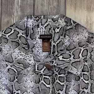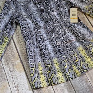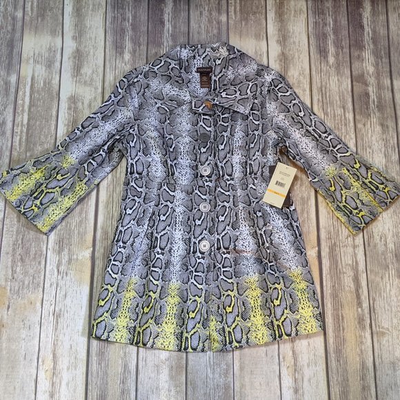 Black and white snack print light weight jacket with bright highlighter yellow dipped accent by Multiples