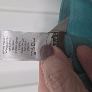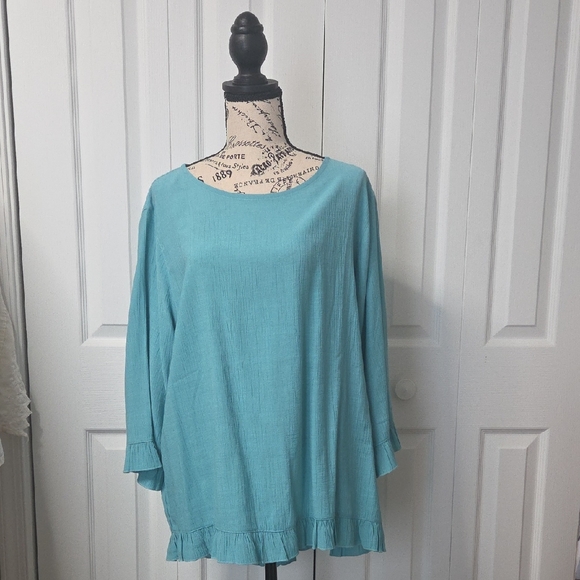 Chic turquoise tunic with ruffle accents at wrists and hem. High/low hem with decorative buttons down center back. Ballet neckline. Lightweight viscose polyester blend fabric to machine wash cold. Generously sized XL. Perfect for casual outings. Pair with jeans or leggings. In excellent pre-owned condition with no rips or stains. From my pet friendly non-smoking home to yours.