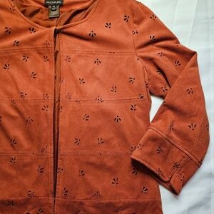 Multiples Womens Burnt Orange Dress Jacket with Scalloped Bottom. small amount of fuzz coming from one of the flowers pictured. Size PS Petite small measurements pictured