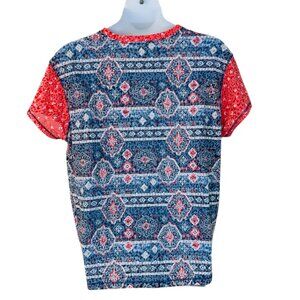 Multiples blue, teal, red and white abstract print burn out knit top - Semi-sheer - V-neckline - Short sleeves - Straight hem with side slits - MSRP $63.00