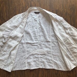 This Multiples Women's Top is a white linen jacket in size XL making it a stylish and lightweight outerwear piece perfect for the warmer seasons. Made from lightweight and breathable linen fabric, this short jacket features a tailored design with a ruffle accent, 3/4 sleeves, and fabric covered buttons. The bell sleeves and ruffle details add a touch of flair to the basic jacket style, making it a versatile option for everyday wear. This machine washable jacket is ideal for the summer and spring seasons, offering both comfort and style for the modern woman.