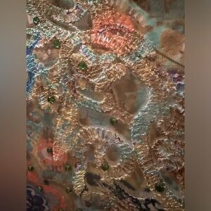 Beautiful Multiples brand short with 3/4 sleeves and abstract floral designs. Embellished with lace on the front and a small amount of bling. Lightweight knit that you can wear through spring and even summer, depending on climate.