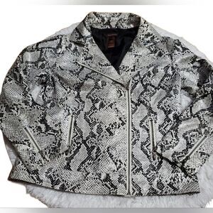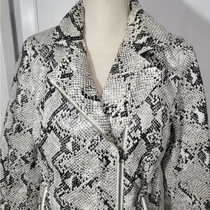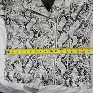 Trendy snakeskin moto leather jacket cream/white, black/gray, with silver highlights around the 'scales.' Thin - perfect for all seasons and layering Size small - fit to be slightly oversized Shell + lining = 100% polyester