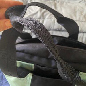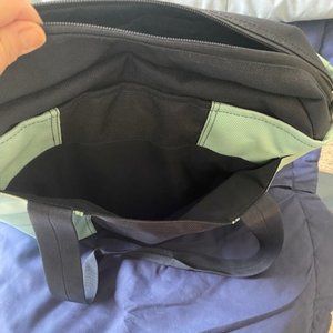 This bag has so many pockets! Perfect as a diaper bag or using to go to the gym. Inside pocket holds a water bottle plus usual slots for pens, phone and other items. The bag is not overly large but holds so much! Entire bag zippers closed, except for 2 outer pockets. Woven, durable fabric. Re-enforced handles. Removable, adjustable shoulder strap. Colors are light teal and navy.