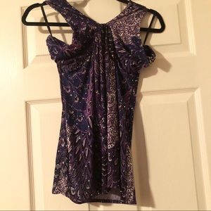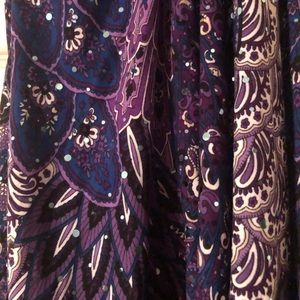 Multi print Halter Top. Different shades of purple and blue. Ties at back of neck. Unaluna brand. Size is not marked. I would say a medium.