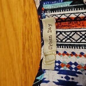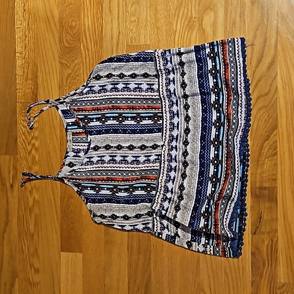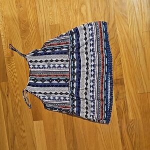 spaghetti adjustable straps, tribal pattern, cute navy pom pom embellishment on hem, great condition.