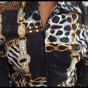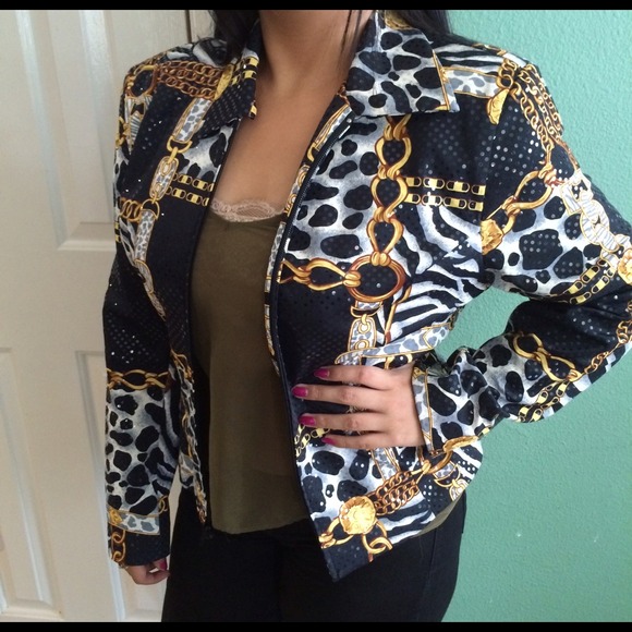 Very beautiful jacket, like new. Multiprint with leopard and gold chains. It also has clear sequins to give it some glitz.