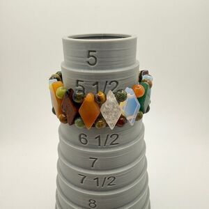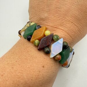 This bracelet is about 20mm thick and is full of agates, jasper stones! There are some opalite glass "stones" in there as well.