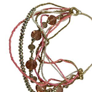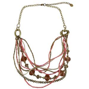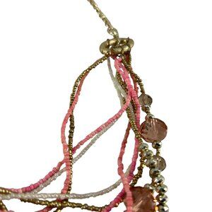 Multistrand Beaded Necklace Pink Gold Tone Layered Statement Jewelry Boho in good preowned condition. Measures 21-24" long.