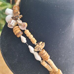 Multistrand Beaded Necklace Sea Shells Wood Beads Long 30 Inch Nautical Tropical