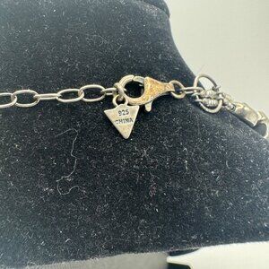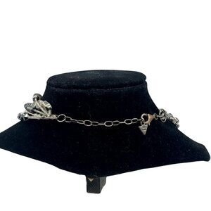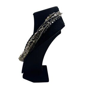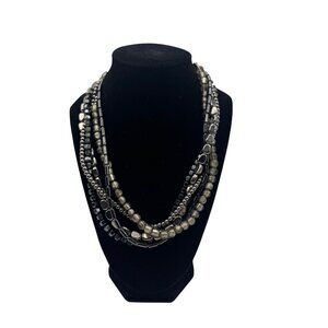 This multistrand statement necklace features an elegant combination of silver-toned and sterling .925 beads, with sizes ranging from rounded to faceted shapes. Adjustable from 16 to 18 inches, it is secured by a lobster clasp and marked with a .925 sterling silver tag, showcasing subtle sophistication.