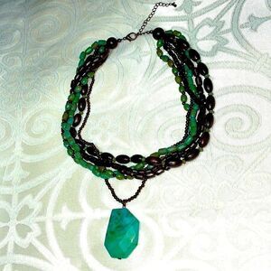 Multistrand faux turquoise pendant adjustable necklace of browns and blue green. Please see measurements in photos. Lightweight materials compared to glass or stone. Southwestern style appeal. Lobster clasp. Great pre-owned condition. Bundle with more items from my closet to save.