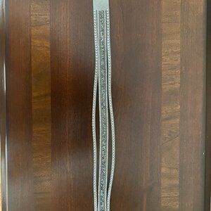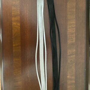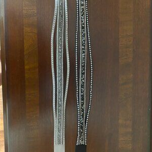 Two bracelets (one black and one grey) that feature a combination of studded faux leather/suede bands, crystal embellishments, and chain detailing.
