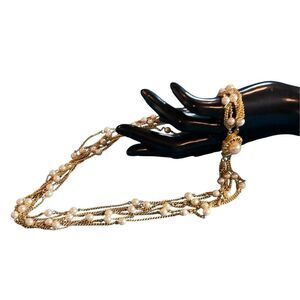 Gorgeous multiple stranded gold and pearl necklace with beautiful big pearl clasp. Take a suit from bland to top notch with this bold and beautiful piece. A stunning addition to any outfit. Measurements in pictures.