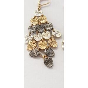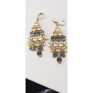 The earrings in the latest image feature a lovely design composed of interlocking leaf-shaped elements in varying metal tones, including gold, silver, and gunmetal. These elements are intricately textured, creating a shimmering effect as they catch the light.