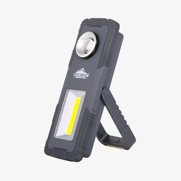 This new multiuse LED camp light is dark gray. It uses LED technology. The light output is 250 lumens. Its dimensions are 6.5L x 2.5W x 1.25"D. This camp light can be positioned in three different ways. The adjustable kickstand lets you stand it on a flat surface. The magnetic base allows you to attach it to metal surfaces. The 360-degree hook lets you hang it around your campsite or inside your tent. This versatility makes it useful in many situations. By purchasing this item, you're supporting Father Joe's Villages' mission to prevent and end homelessness in San Diego.