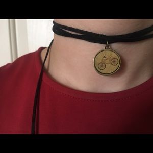 FUN necklace with bike charm tied off with pearls on the end!! Can be single, double, triple wrap choker. Tied, loose tie, bracelet... anything!!!