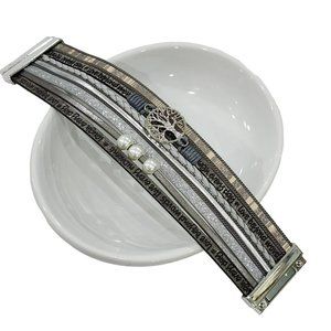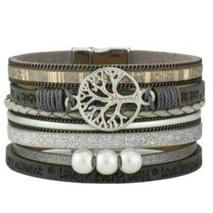 Multy Layers Leather Bangle Magnetic Bracelet for Men and Women 7.5in - Silver