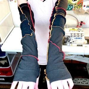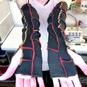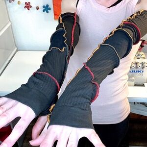 Patchwork distressed arm warmers/fingerless gloves with thumb holes. Over the elbow/full arm length. Dark brown and black nylon with cozy black cotton stripes along the side. Funky red and orange accent/zombie stitching. Made with upcycled/recycled/reworked materials. Can also be worn slouched or as tight leg warmers/footless socks. I also made these in more color combinations!