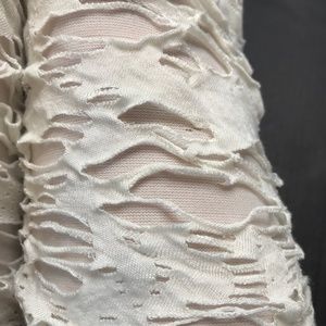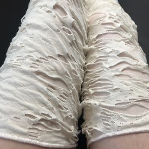 Long light cream white holey/ripped layered legwarmers. Over the knee length. The shredded material is layered over a soft knit material. Great for cosplays, halloween costumes and gothic/alternative outfits! I also make a matching gloves, armwarmers, and these in a gray/black color!