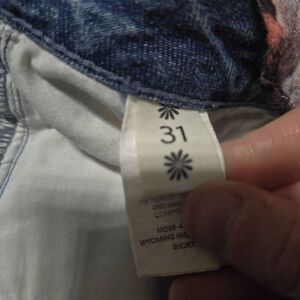 Details: factory cut off and rips, light wash, no stretch, front and back pockets, zip fly