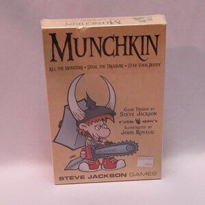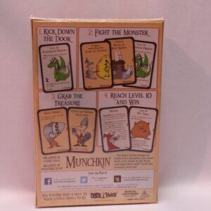 Munchkin is the mega-hit card game about dungeon adventure . . . with none of that stupid roleplaying stuff. You and your friends compete to kill monsters and grab magic items. Don the Horny Helmet and the Boots of Butt-Kicking. Wield the Staff of Napalm . . . or maybe the Chainsaw of Bloody Dismemberment. Start by slaughtering the Potted Plant and the Drooling Slime, and work your way up to the Plutonium Dragon!