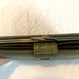 This listing is for a Mundi brand Green Leather Wallet in a Faux Alligator print. It has a Butterfly Kiss Lock closure on the back, a checkbook holder and a Snap Closure. It is in nice condition and works well as a clutch.