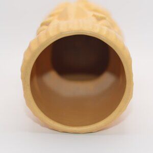 • Bold mustard yellow glaze with sculpted humanoid figure — exaggerated facial features, carved wood texture, and full belly design