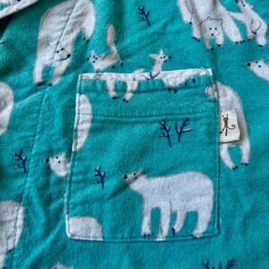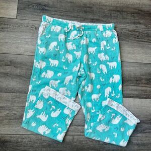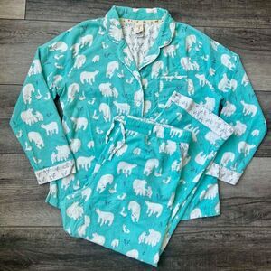 Munki Munki Bamboo Cotton Polar Bear Blue Womens Pajamas Soft Colorful Pattern in size LARGE. Excellent quality- feature front pocket, super soft cotton, pants pockets (2), snap up hem on pants, and stretchy tie waist. There are no stains/tears but there is some pilling on the fabric due to it being finer cotton material. Incredibly soft. Smoke free home and FAST SHIP!