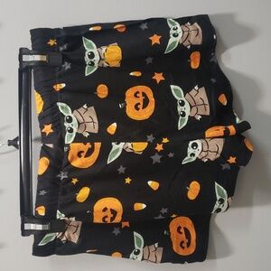 Black shorts featuring Baby Yoda, candy, stars and Halloween pumpkins