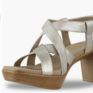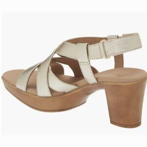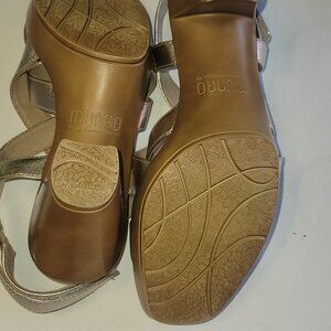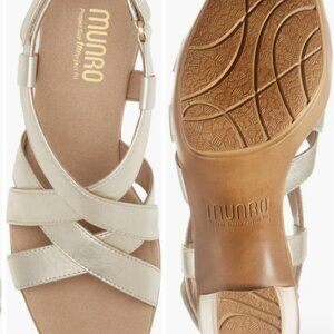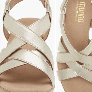 This Munro Maddox is a gold platform sandal - worn twice! It is a size 8.5 and features a platform sole. See last pic for only evidence of wear - a tiny mark on heel.