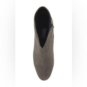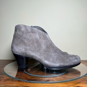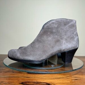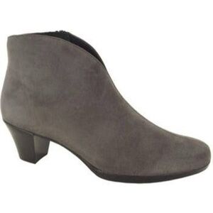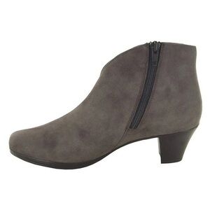 An easy, stacked heel perfects the feel of a wear-with-anything bootie designed for daylong comfort. 2" heel height; 5" shaft height. Side zip closure. Leather or suede upper/textile lining/rubber latex sole. By Munro; made in the USA of imported fabric. Women's Shoes.