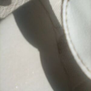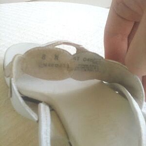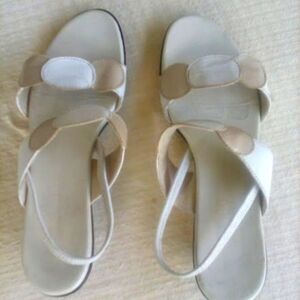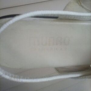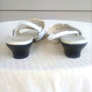 Munro women's double vamped white and cream comfort sandals in size 8N for a narrow foot. The rubber outsole has an attractive contoured 1.5" heel. The leather uppers are two vamps made of alternating white and cream circles and leather and elastic sling backs. The uppers have a pearlized finish. There is supportive padding to the insoles. They are quite pretty and very comfortable. There is a non slip texture built into the insoles at the balls of the feet. There is a slight crease which does not effect the function or the comfort of the shoes at the balls of the feet. They are in very good pre-owned condition with no noticeable wear.