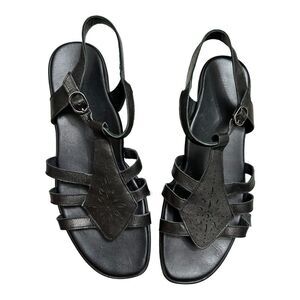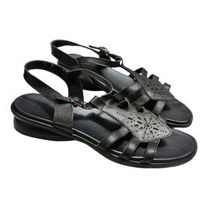 Munro USA made black leather strappy comfort sandal with perforated starburst pattern on vamp. Adjustable ankle strap with silver buckle - Made in the USA - Leather upper, rubber shock absorbing sole. Smoke free dog friendly home. All wear and tear & any flaws shown in pics