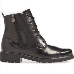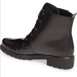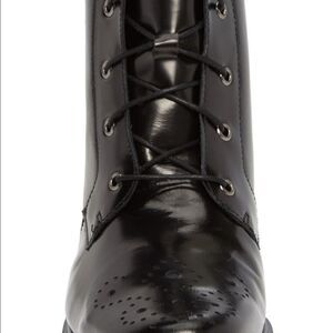 narrow perforations decorate the rounded toe of a sleek leather boot in a classic lace-up, combat-inspired silhouette.