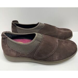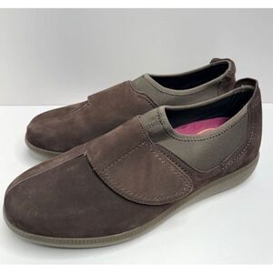 Keywords: comfort shoes, slip on shoes, brown shoes, suede shoes, hook and loop closure, casual shoes, walking shoes, easy closure, comfortable footwear, men's shoes, women's shoes, orthopedic shoes