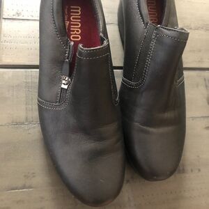 These are the Munro Leather Walking Wedges. These are a leather walking shoe, in size 8 with a side zipper in black. These are in excellent, like new condition, with just a little wear/dirt on the sole, and very little to no wear everyplace else. These are the original, famous Munro name brand and retail for $220, but you can buy these for a fraction of that here!