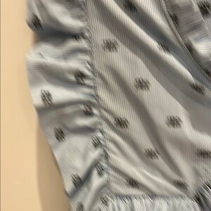 Elegant blue dress with ruffled sleeves. Features a subtle pattern and wrap design.