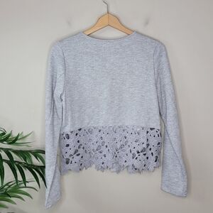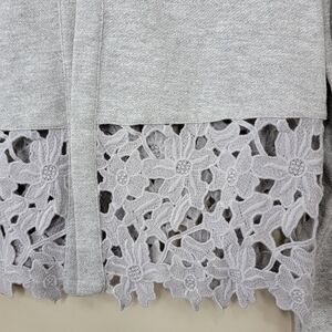 Heather gray sweatshirt cardigan with hook & eye closure at neck and floral lace cutout hem.