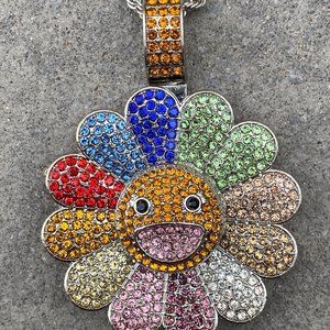 Amazing smiling flower necklace featuring Takashi Murakami flower artwork. Features shiny multicolor gemstones on a silver colored backing.