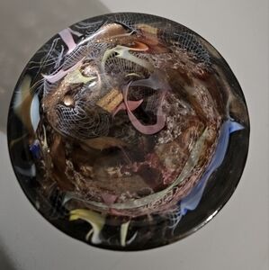 This stunning abstract glass art piece features a captivating blend of colors, perfect for adding a touch of elegance to any home decor. The intricate design showcases a harmonious mix of brown, pink, and blue hues, creating a unique visual experience.