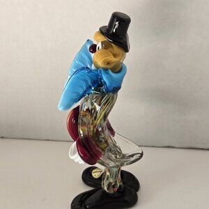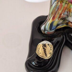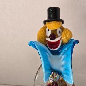 This 8" Murano art glass clown figurine is a hand-blown piece from Italy, adorned with a blue bow hat. Featuring vibrant multicolor hues and a glossy finish, this vintage decorative item captures the whimsy and charm of mid 20th-century design. Crafted with art glass production technique, this unique figurine showcases the skill and craftsmanship of Murano glassmakers, making it a delightful addition to any collection or display.