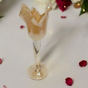 This gorgeous "wine glass like" pillar candle holder stands 14" tall. The base is 5" across, and the curled edges of the creamy peach to clear light gold tops span max 6". This is a very rare find and hand blown. The stems are flared and so elegant in an iridescent golden colored glass.