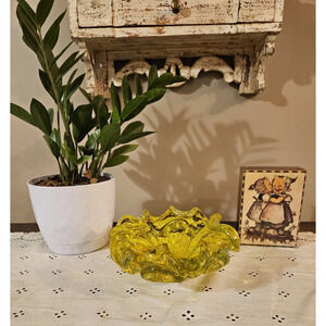 The Murano Double-Ruffle Controlled Bubble Yellow Candy Dish is a vintage piece produced in Italy during the 1950s. This unique candy dish features a controlled bubble pattern in a vibrant yellow color, with a glossy finish and a hand-blown production technique. With a mid-century modern style and a single compartment, this 8" dish weighs 3 pounds and adds a touch of art glass elegance to any collection of decorative cookware and serveware. We take pride in safe packaging our sales. Please visit our store for additional glassware.