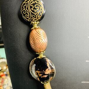 DESCRIPTION: This stunning example of big chunky Murano glass beads with copper foil glowing through, blended with carved metallic and acrylic beadwork, will add just the right touch of glitter to any outfit.