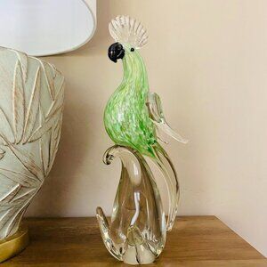 Murano Glass Cockatoo Bird Sculpture Green & Clear Art Glass 13.5" Tall